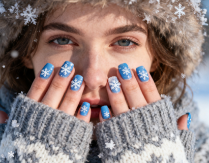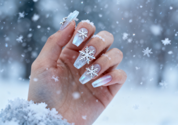 沒有什麼比雪花美甲更有節慶氣氛了。先塗上冰藍色指甲油,再添加細緻的雪花圖案或貼紙。一點閃粉能讓它們像霜一樣閃爍動人。