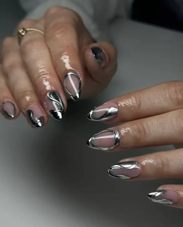 I think metallic elements will be one of the main trends in 2026, “Istomina told us. Although metal nail art is not a new thing, its popularity has skyrocketed recently. We not only see gold and silver nail art, but also chrome accents and various metal nail accessories that instantly transform your fingertips into heavy metal rock queens.
